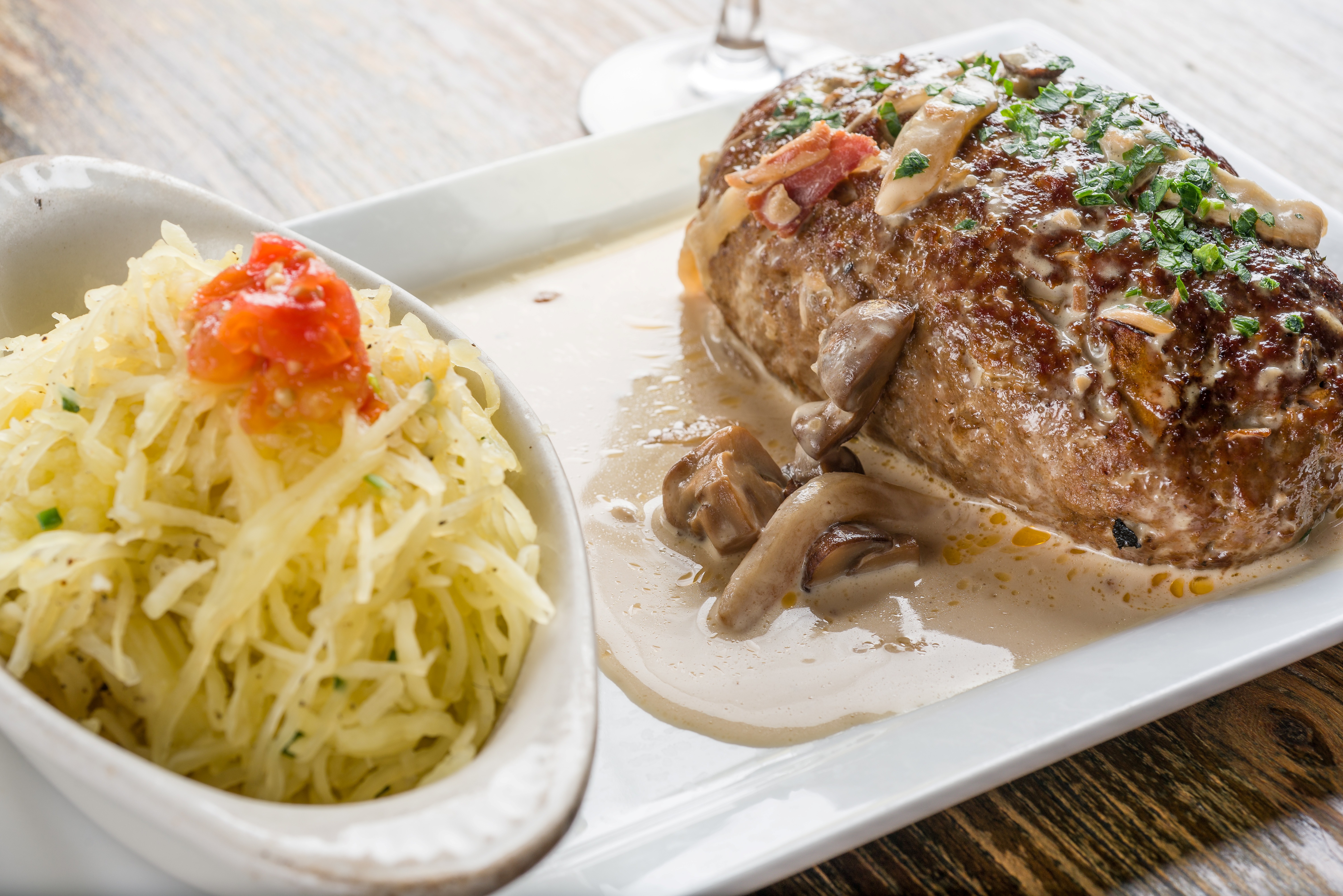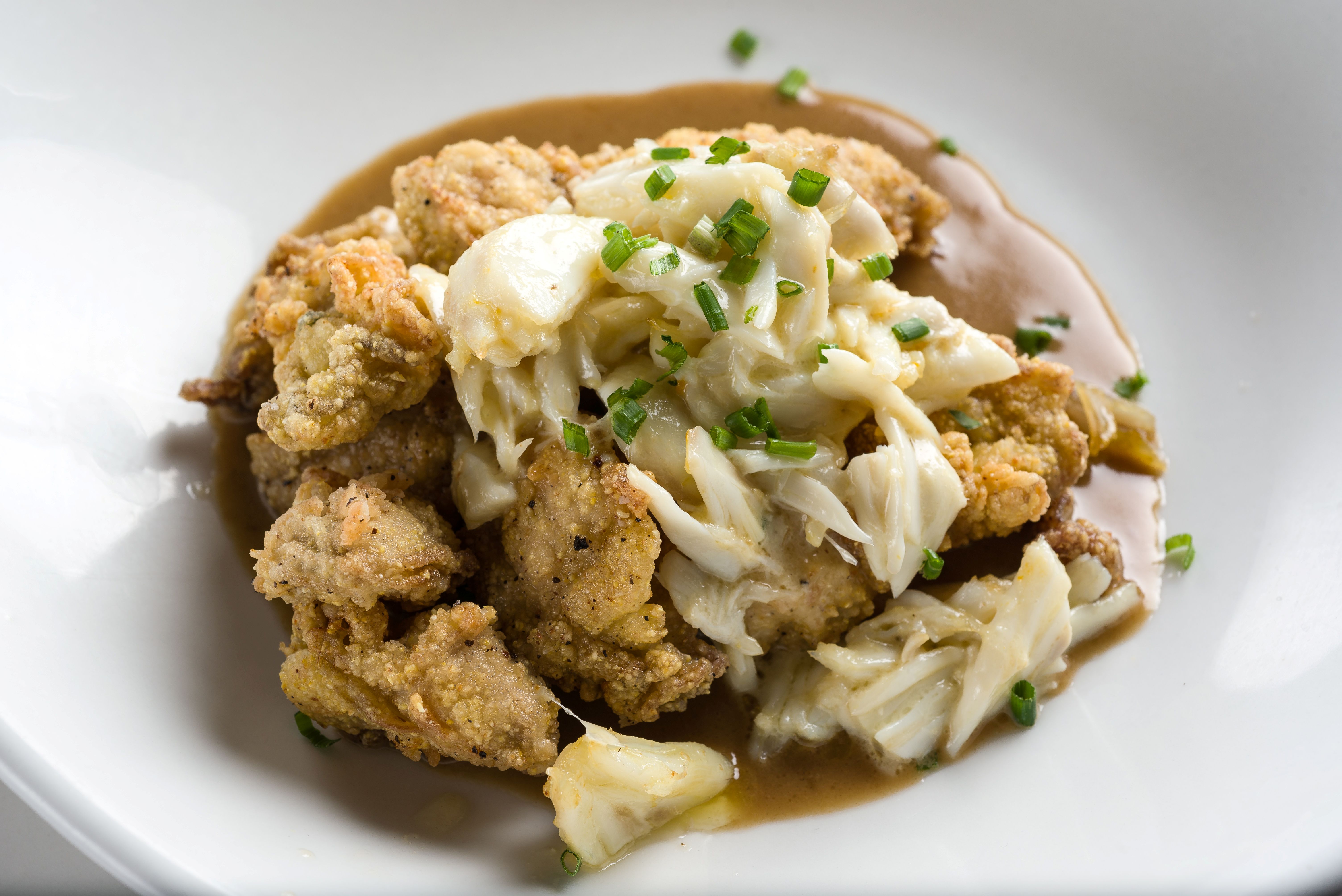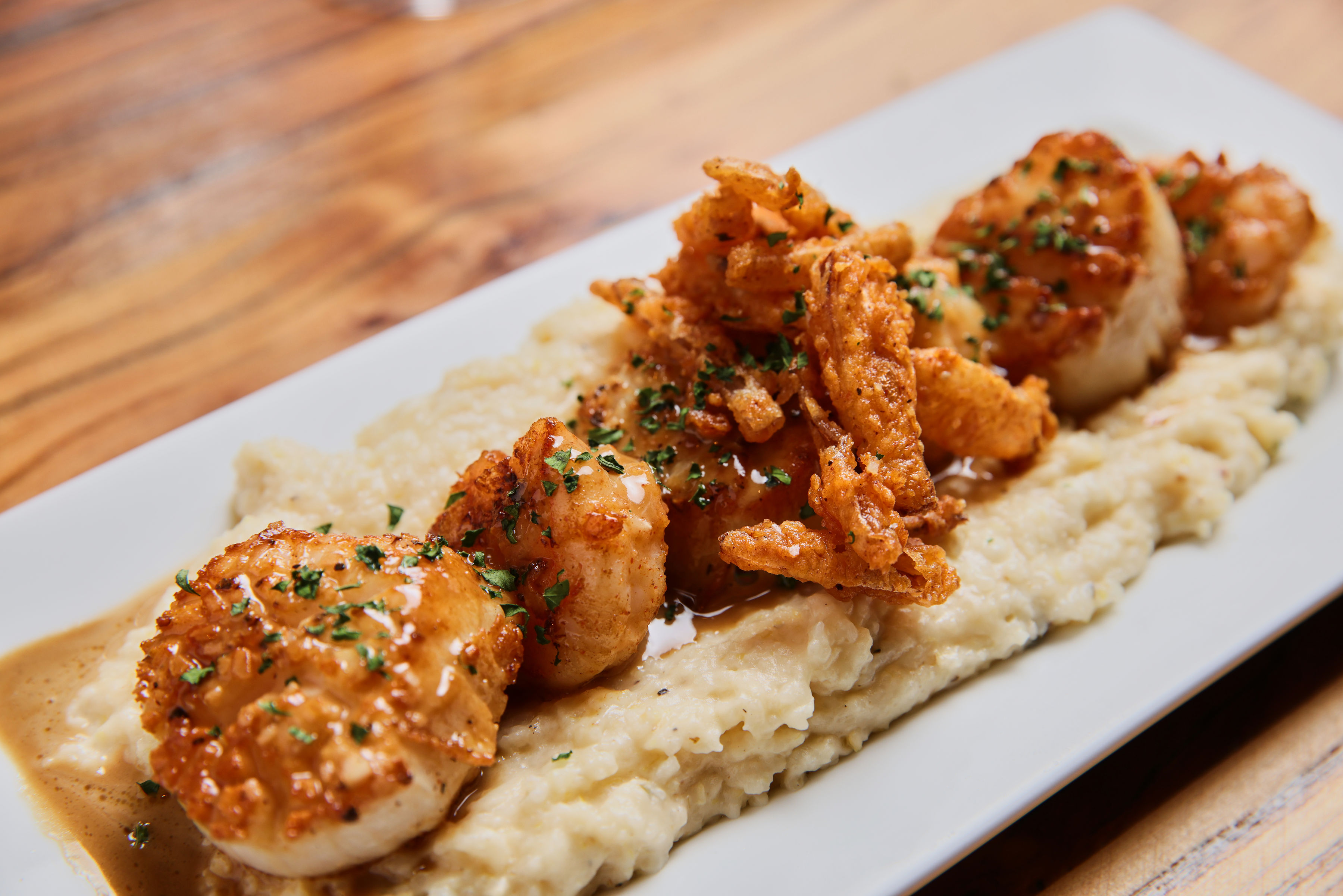 Served over our rosemary grits, crispy tobacco onion, shallot cream sauce