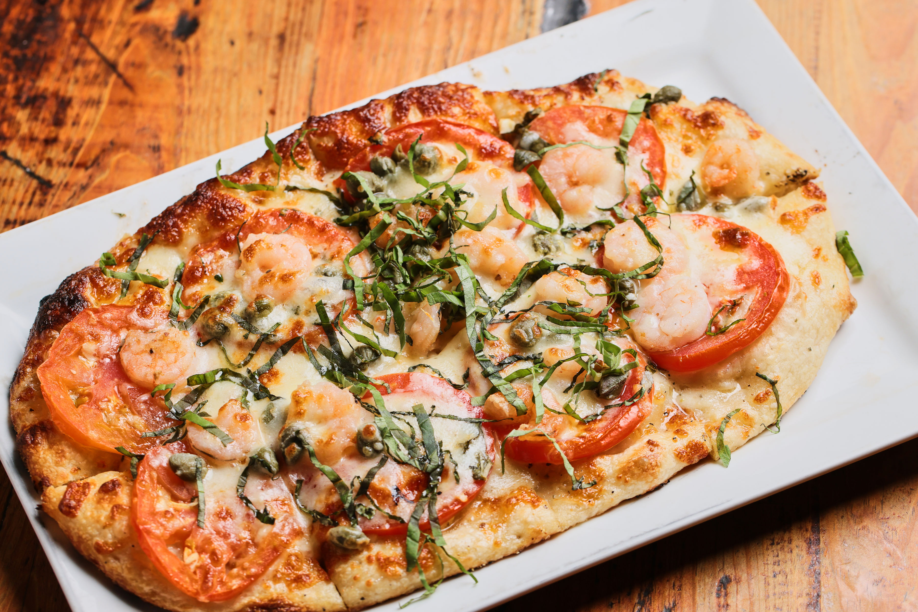 Brandy cream sauce, Gulf shrimp, pancetta, smoked mozzarella, capers, roma tomatoes