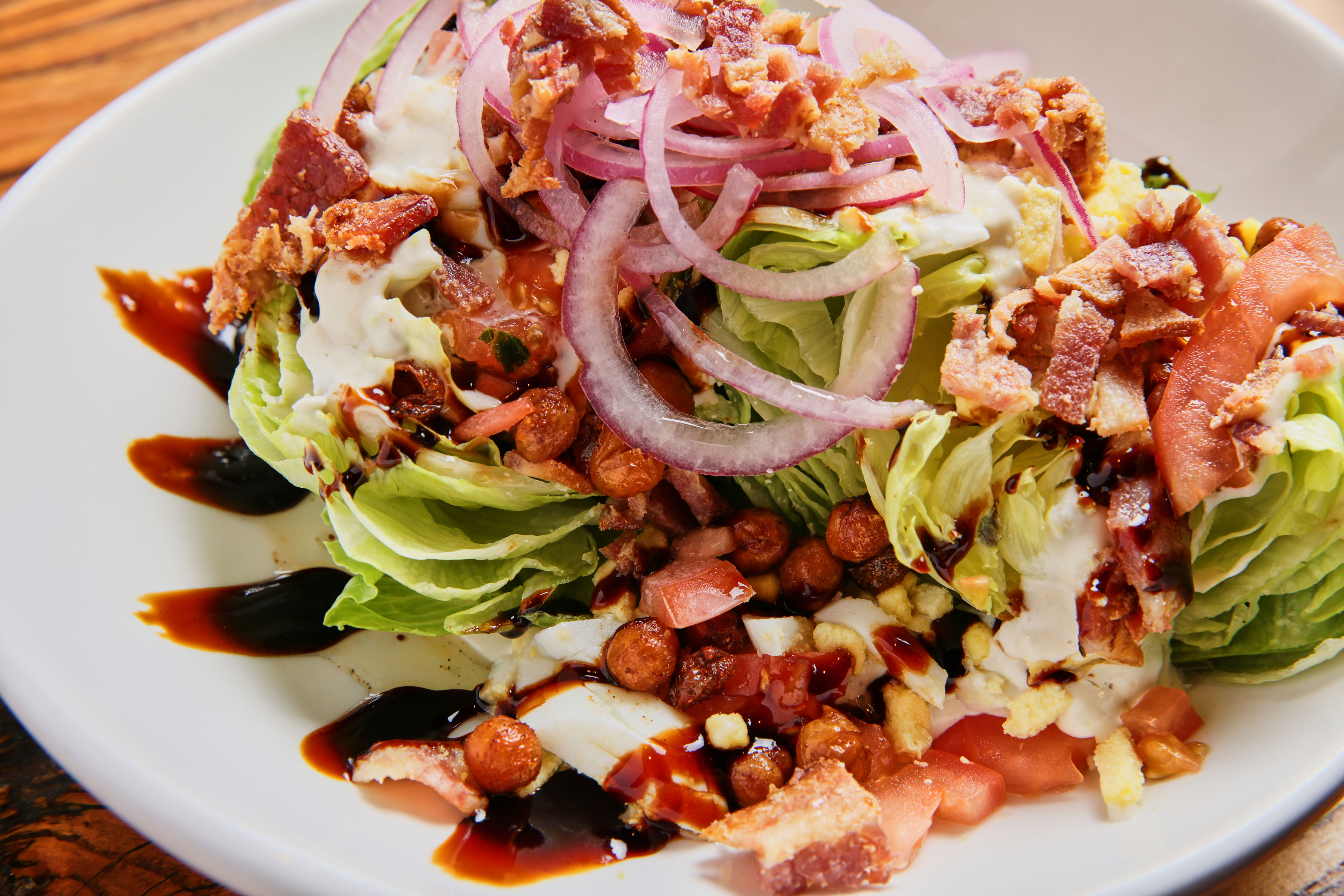 Iceberg lettuce, blue cheese, diced tomatoes, boiled egg, red onion, bacon, fried chickpeas, balsamic glaze, blue cheese dressing