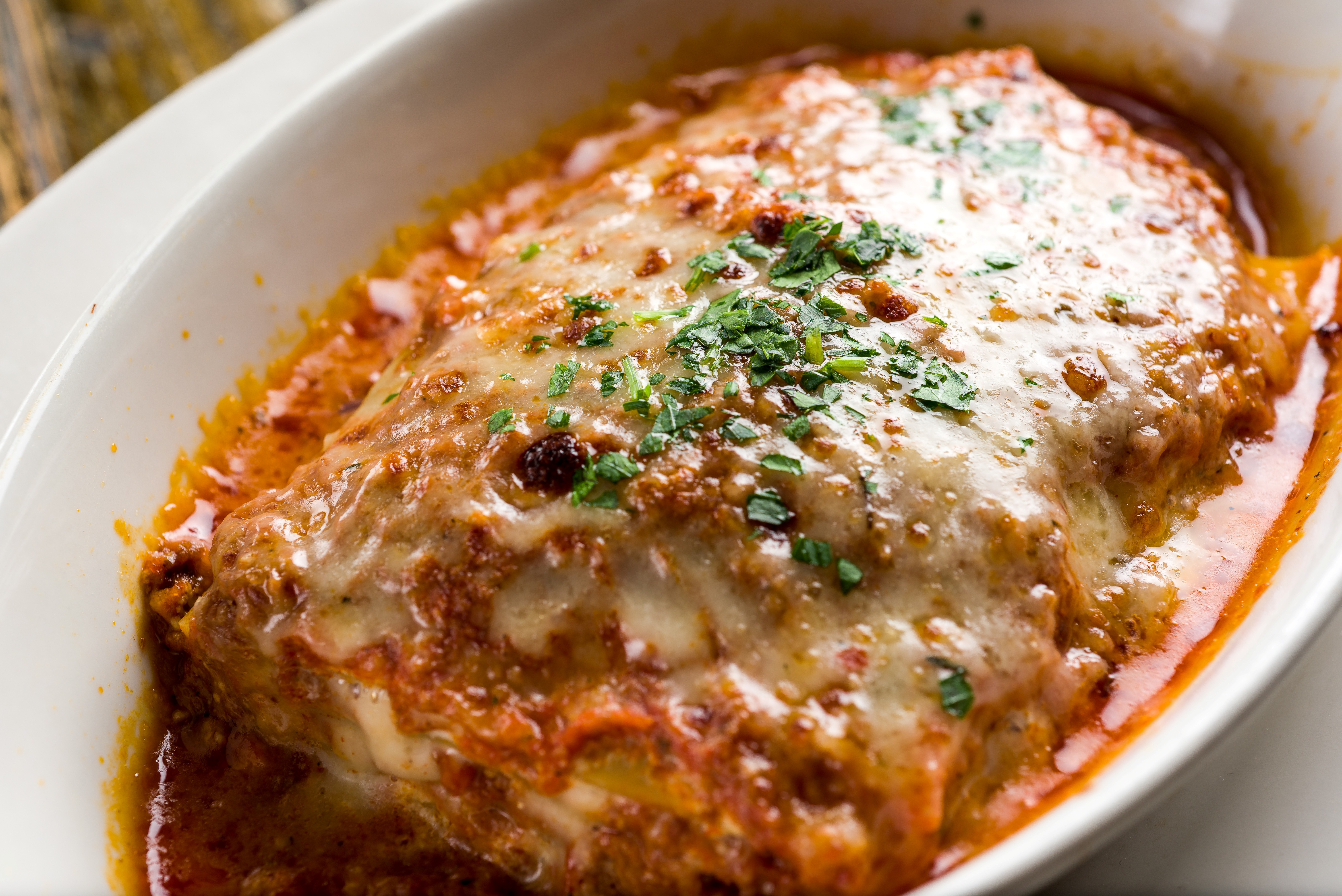 Our meat lasagna layered with fresh herbs, plum tomato basil sauce, five Italian cheeses