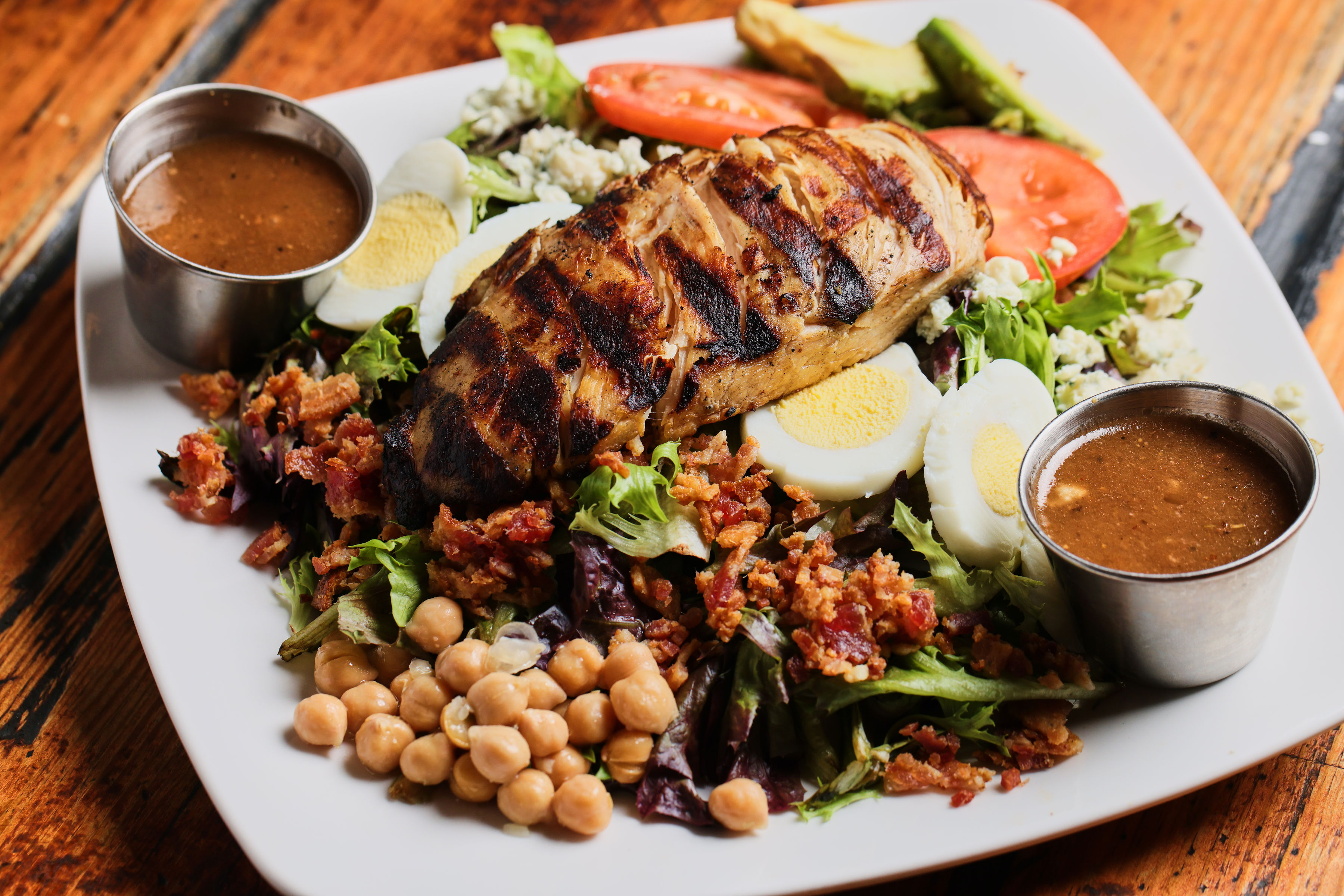 Wild greens, grilled chicken breast, boiled egg, bacon, chickpeas, avocado, tomatoes, gorgonzola, choice of dressing