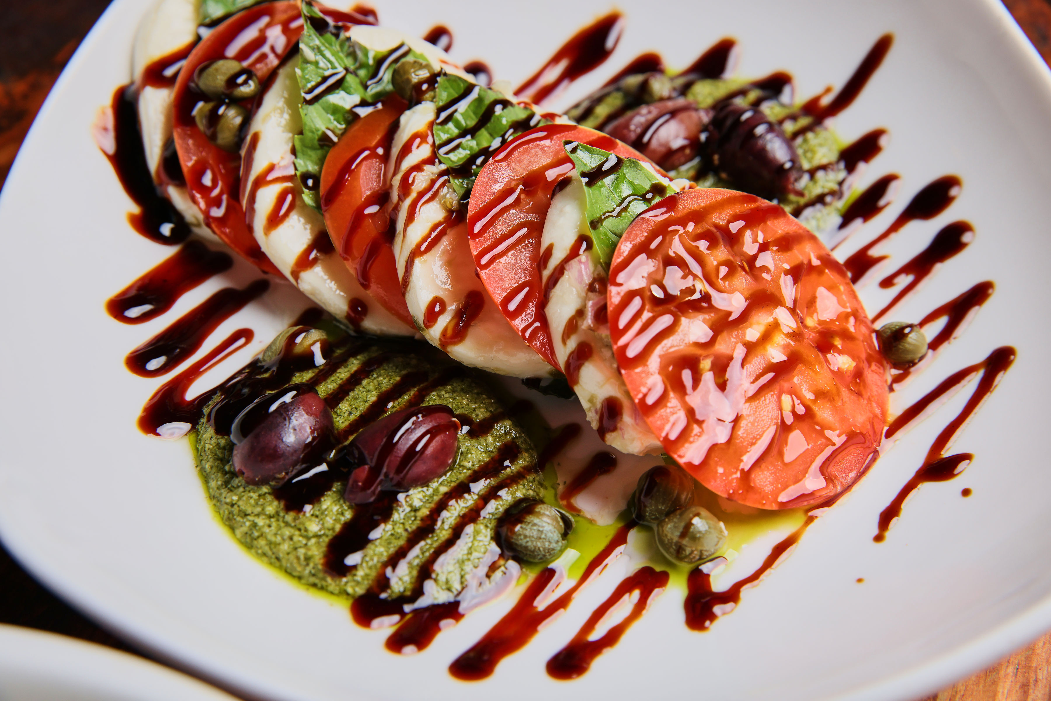 Vine ripened tomato, fresh mozzarella, capers, tuscan olive oil, fresh basil, pesto, balsamic glaze