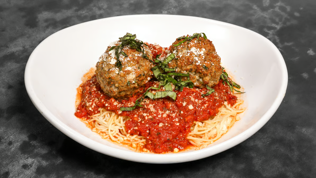 Two 4 oz meatballs served over angel hair pasta with marinara and Parmesan cheese